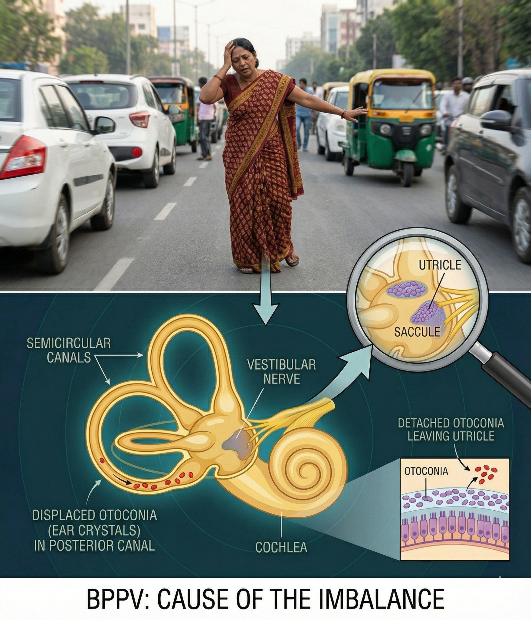 When the head moves, these misplaced crystals create abnormal fluid movement in the canals, sending false signals to the brain that produce an intense spinning sensation — usually lasting under 60 seconds per episode.